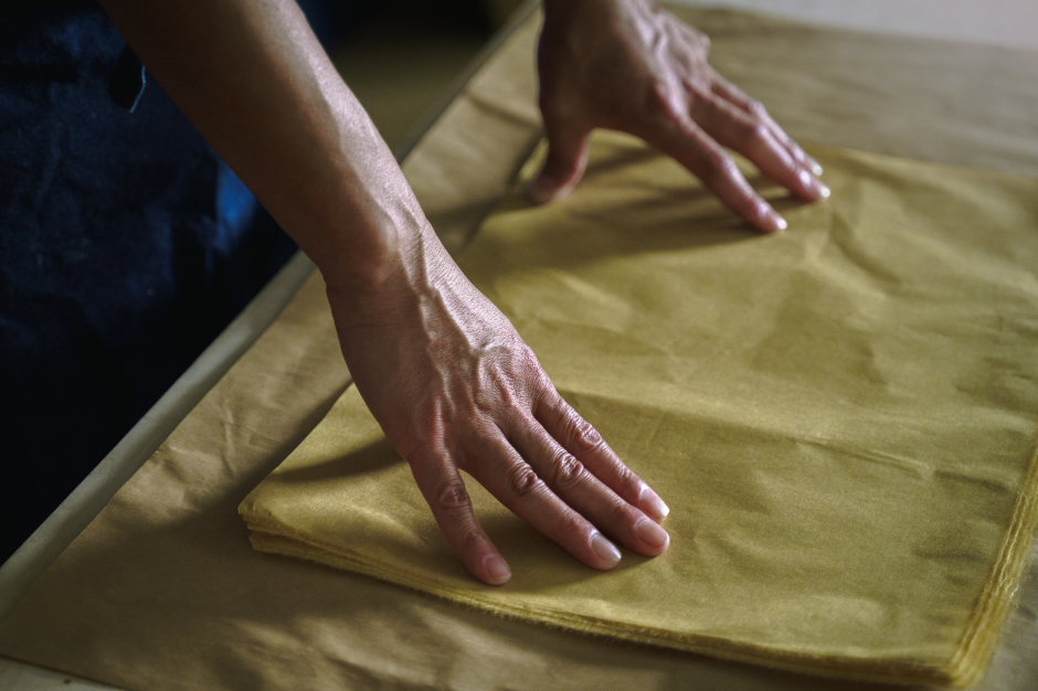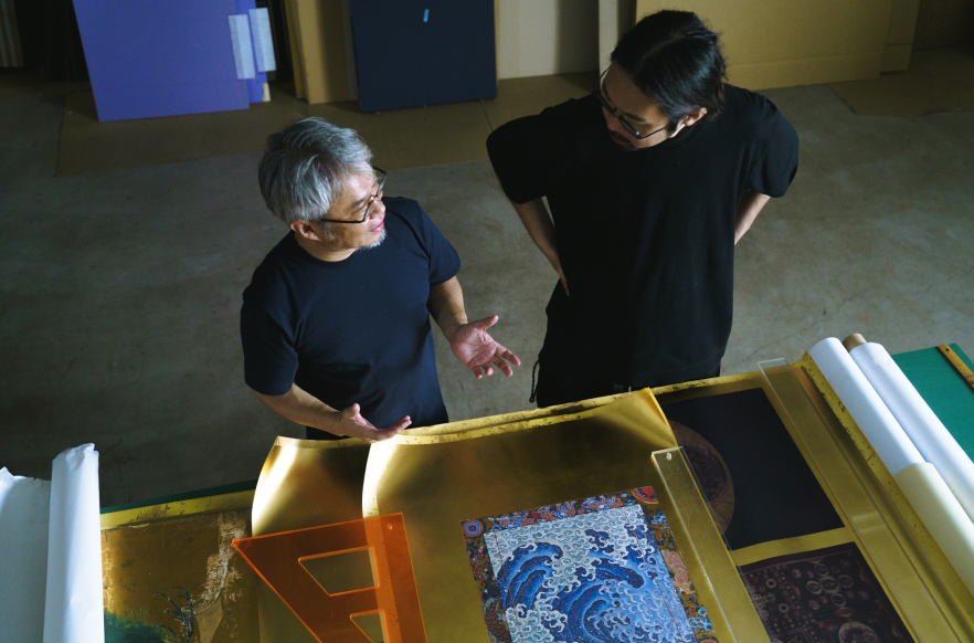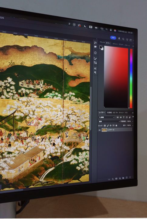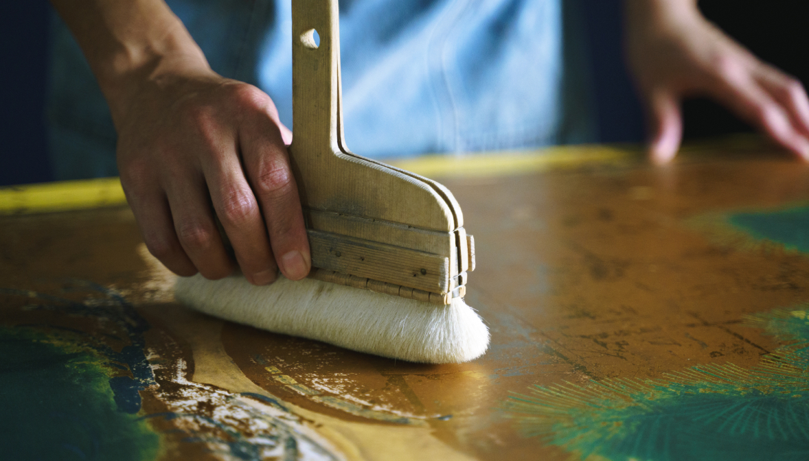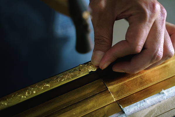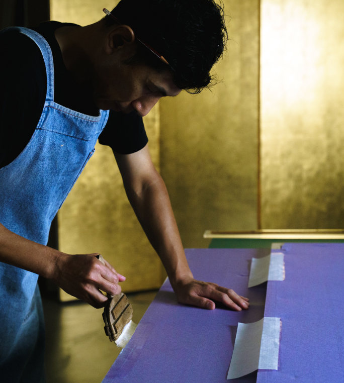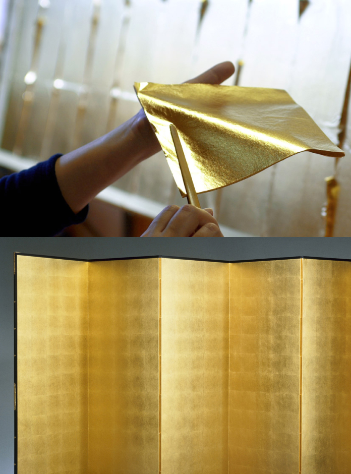 本金箔や真鍮箔、オリジナル和紙・壁紙など、多彩な素材で制作し、神社仏閣やホテル・料亭など「ハレの場」にふさわしい屏風をお届け。