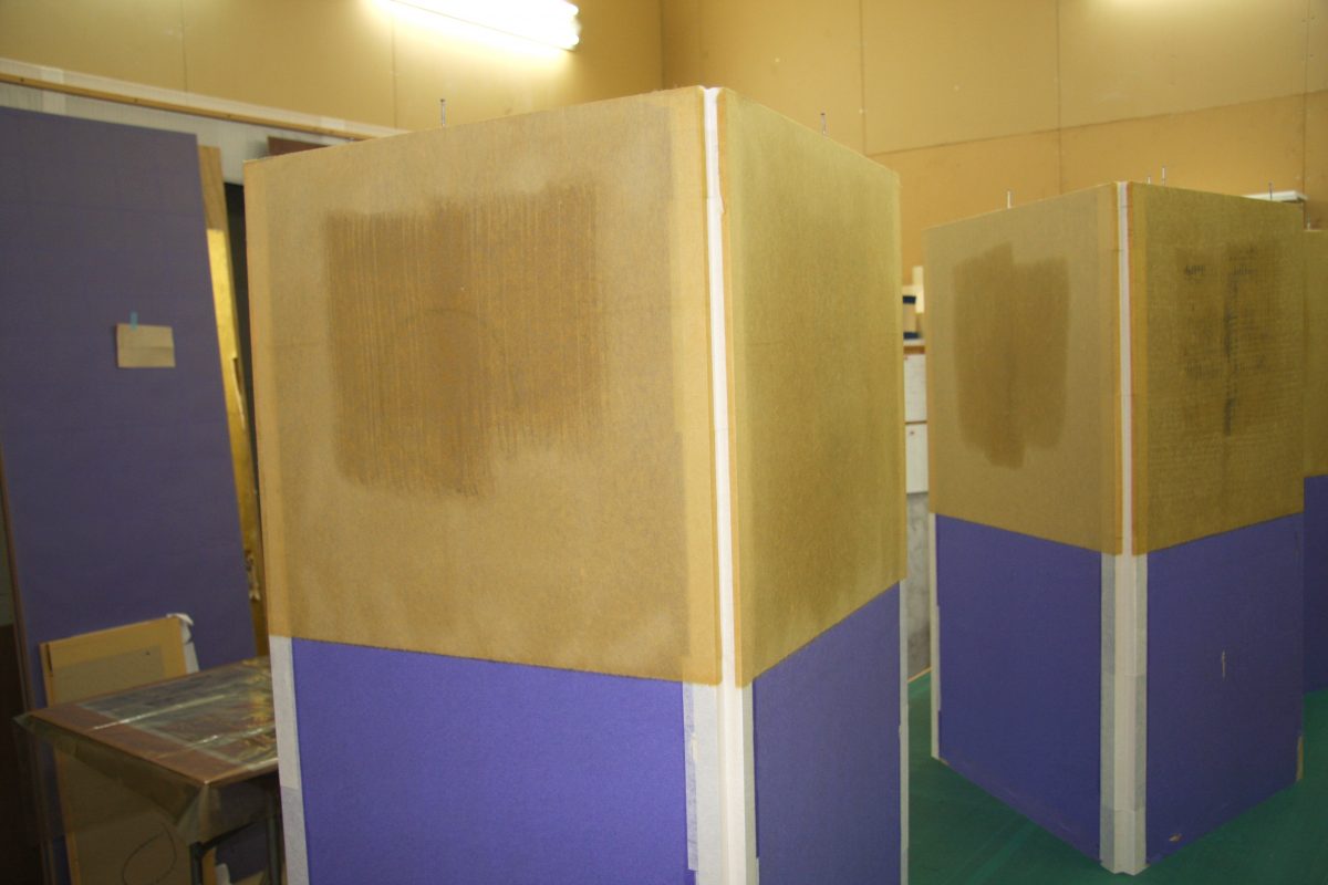 蝶番部分を交換するには、蝶番を隠している表面素材(例:金箔や和紙)をはがさなければなりません。同時に、裏面も連動しているため、ただ蝶番だけをピンポイントで差し替えるわけにはいかないのです。結局、修理箇所周辺の表裏の素材を巻き戻し、新しい蝶番を仕込み直してから、再び金箔や裏布を張り直す作業が必要になります。