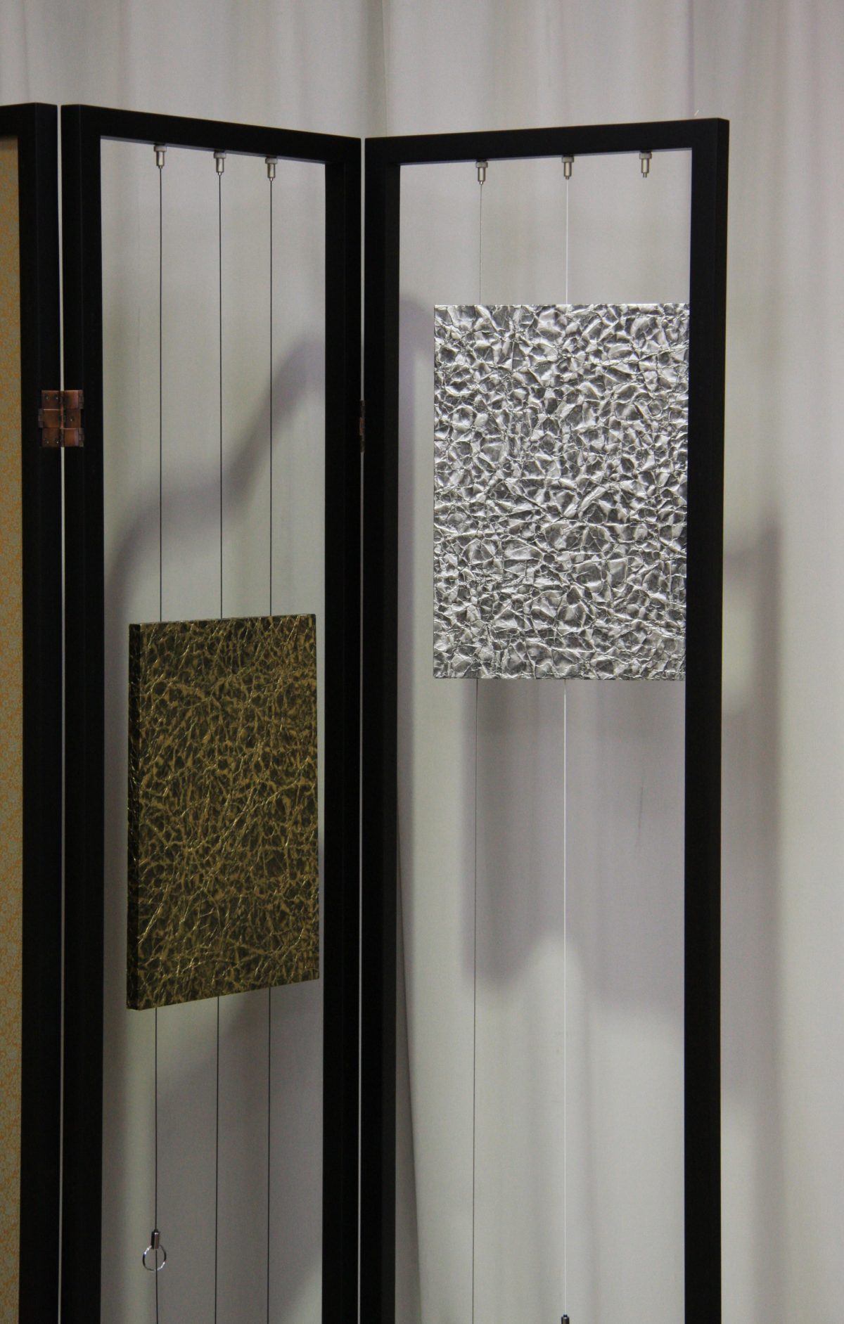 特徴的なのは“もみ紙”と呼ばれる素材を採用していることです。あえて紙をくしゃくしゃに折り、シワ状の風合いを残した独特のテクスチャーがポイント。光の当たり具合によって微妙な陰影が生まれ、単なるフラットな銀箔とは一味違う表情を醸し出します。