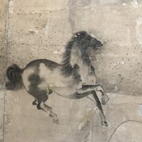 「群馬図屏風」は、一頭の馬が颯爽と駆ける姿を水墨画で描いた作品。背景は経年劣化が進んでおり、ところどころに破損や色褪せが見られますが、それでもなお、馬の躍動感や勢いを感じさせる筆致には圧倒されるものがあります。