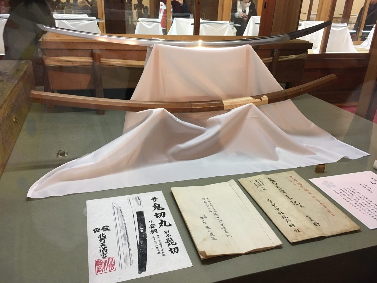 北野天満宮の境内を歩いていると、宝物殿がありました。こちらでは刀や薙刀といった貴重な武具が多数展示されています。